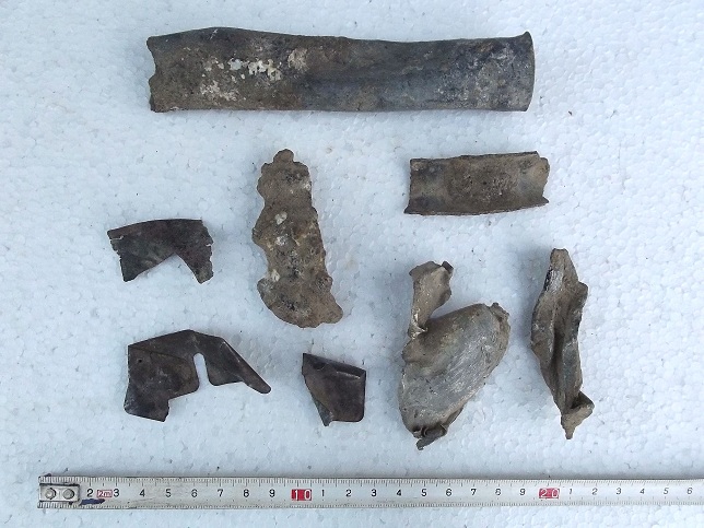 Spora część odnalezionych elementów aluminiowych została stopiona (forma zbrylonego aluminium) w skutek pożaru jaki wybuchł na pokładzie po walce z samolotami myśliwskimi i awaryjnym lądowaniu. Wśród różnych elementów znajdują się przedmioty wstępnie określone (prawdopodobnie ?) jako: fragment butli z instalacji powietrznej, pompa z instalacji hydraulicznej, łącznik instalacji powietrznej, fragment wzdłużnicy statecznika (z zachowaną powierzchniową malaturą), końcówka przewodu antenowego/radiowego, końcówka przewodu hydraulicznego, fragment mocowania pasów bezpieczeństwa, zawór lub wyłącznik prądowy, element instalacji powietrznej (zatopiony w bryle aluminium), pompka instalacji hydraulicznej lub paliwa, obudowa wskaźnika/zegara pokładowego (dolnego panelu ?), fragment obudowy wskaźnika/zegara pokładowego, fragment wspornika wnętrza kadłuba/kabiny pilotów (z zachowaną powierzchniową malaturą).