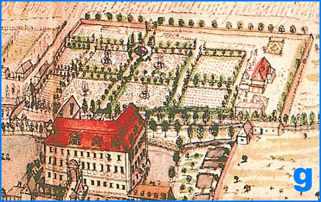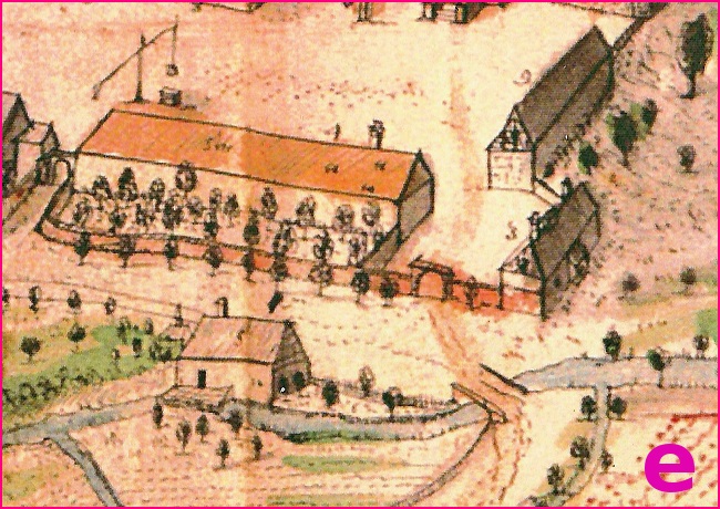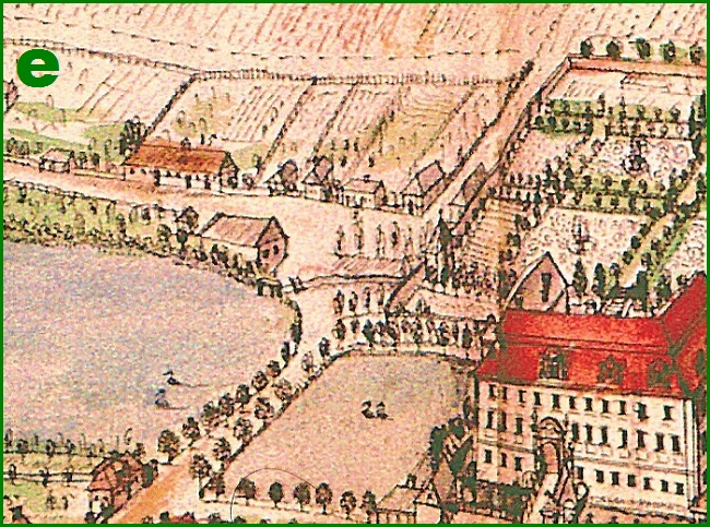 Zabudowania gospodarcze zachodniej części folwarku ogrodzone murem z dwiema bramami wjazdowymi. Widoczne drewniane żurawie studni. Po lewej od zabudowań folwarcznych poza murem charakterystyczna parcela z domostwem w centralnym punkcie skrzyżowania dróg