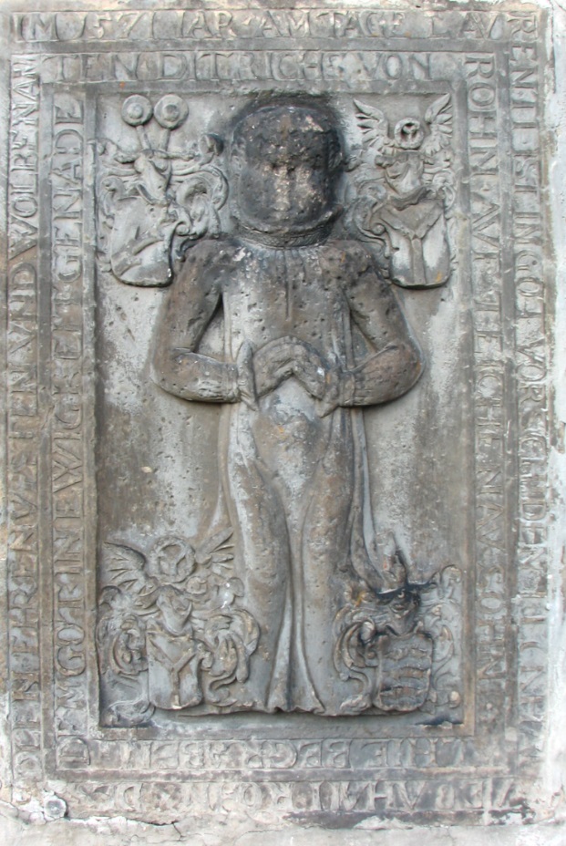 Płyta nagrobna poświęcona zmarłemu w 1571 r. Leonardowi, synowi rycerza Hansa Dietricha von Rohn z Bagieńca, zewnętrzna elewacja kościoła pw. Wniebowzięcia NMP w Wierzbnej