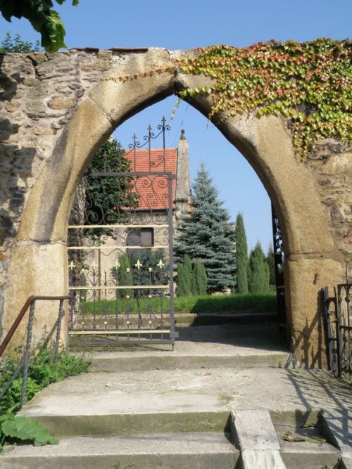 Ostrołukowy portal w południowej części muru kościelnego w Wierzbnej