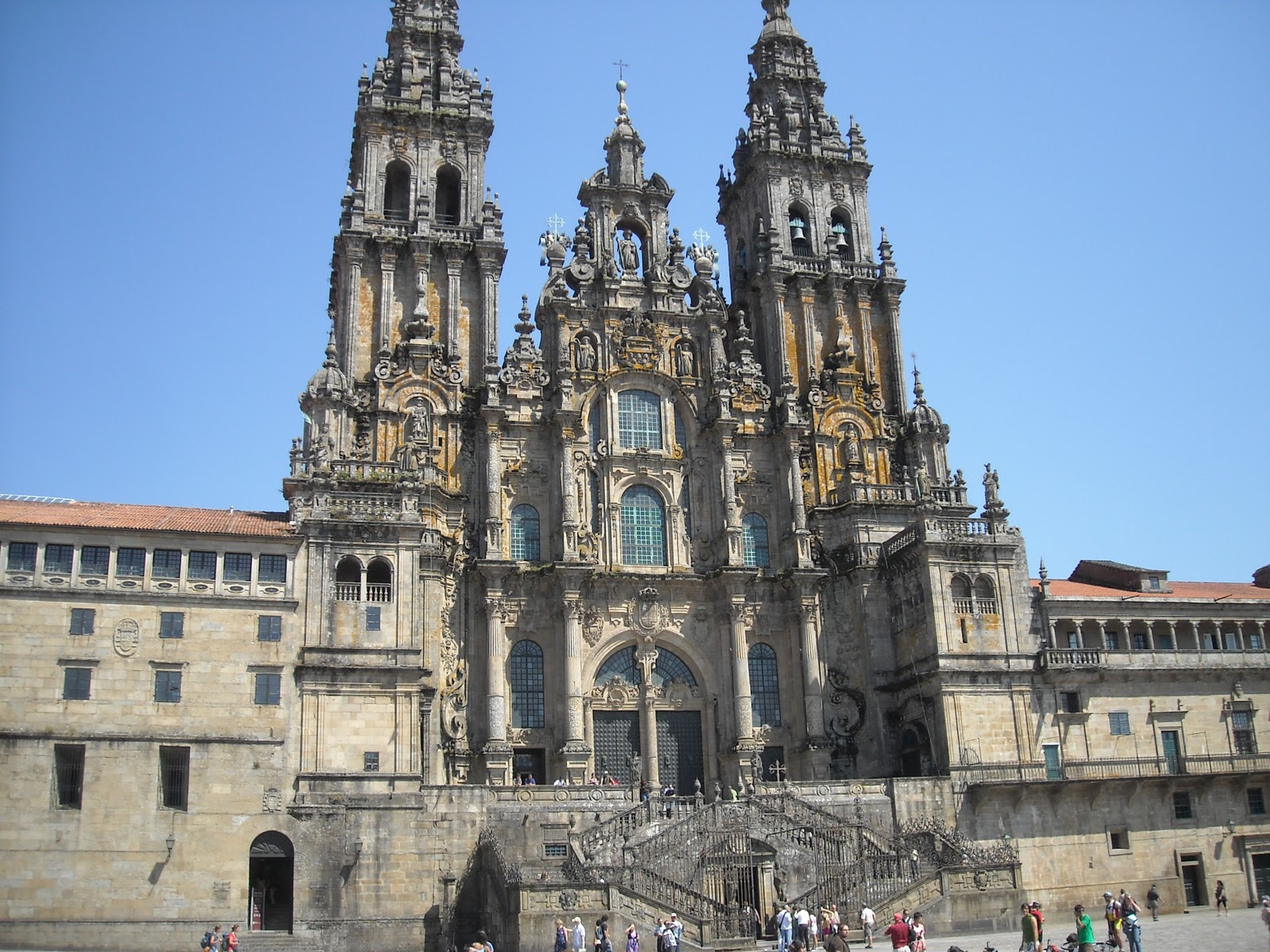 Nazwa Santiago de Compostela wywodzi się od Campus Stellae – pole gwiazd, tzn. od światła gwiazdy, która miała wskazywać „odkrywcy” miejsce grobu świętego. Santiago zaś to słowo wywodzące się z języka hiszpańskiego znaczące - Święty Jakub (St. Jakob). Na początku IX wieku nad „grobem” świętego Jakuba biskup Teodomir wzniósł kościół. Pod koniec IX wieku, na rozkaz króla Alfonsa III zbudowano większą świątynię, konsekrowaną w 889 roku. Została ona zniszczona w 997 roku przez Almanazara. Budowę kolejnej, nowej świątyni, w znanej nam do dziś formie, rozpoczęto w 1075 roku. W latach 1090-1105 zakończono budowę transeptu i dokonano konsekracji ołtarzy. Całą budowlę ukończono do 1124 lub 1128 roku. Rozbudowywano ją w kolejnych wiekach, a w XVII i XVIII wieku przebudowano w stylu barokowym. Główna fasada została zaprojektowana i wykonana w 1738 roku z dwoma wieżami o wysokości 76 metrów, wieżami. O ile zewnętrzny wygląd katedry został wówczas zmieniony, o tyle romański wystrój jej wnętrza nie uległ większym zmianom. We wnętrzu szczególne wrażenie robi barokowy ołtarz główny. W jego centralnej części znajduje się drewniana rzeźba św. Jakuba z 1211 roku, pokryta w XVIII wieku srebrną koszulką wysadzaną drogimi kamieniami. W krypcie pod ołtarzem znajduje się srebrny sarkofag z relikwiami św. Jakuba oraz jego uczniów Teodora i Atanazego.